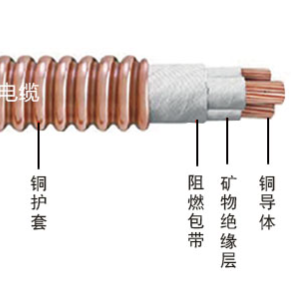 結(jié)構(gòu) 1.電纜導(dǎo)體:有多股銅線絞合而成,具有良好的彎曲特性。2.絕緣層:采用耐高溫,不燃燒的無(wú)機(jī)礦物絕緣材質(zhì)。3.銅護(hù)套:銅質(zhì)材料,經(jīng)特殊加工有良好的彎曲特性,并作為PE線。4.外護(hù)層:采用低煙無(wú)毒的塑性材質(zhì),有良好的防腐蝕特征。
